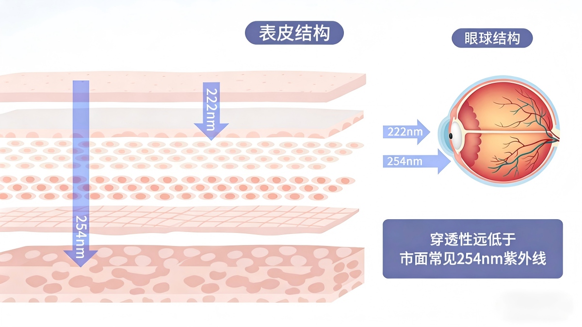 222nm属于国际紫外线协会定义的远紫外线范围200~230nm,除了具备传统的杀菌作用外,还具有以下特点:(1)与254nm相比,222nm紫外线穿透能力弱,波长仅被皮肤角质层、眼睛泪液层吸收,无法穿透至深层活细胞,合规剂量下可在人员在场时持续使用,彻底规避传统UVC的皮肤灼伤、眼部损伤风险,打破“消毒必无人”的局限。(2)222nm远紫外光能实现高效消杀,快速破坏细菌、病毒(新冠、流感、MRSA等)、真菌的DNA/RNA与蛋白质结构,对空气、物体表面、气溶胶中的微生物均有效,无消杀盲区。(3)由于222nm紫外线更易被生物体中的蛋白质吸收,从而使微生物更难被修复,并且其穿透性因这一过程被大大削弱,减少了对细胞等较大生物的内部结构损伤,长期低剂量照射无健康隐患,适配有人场景常态化消毒需求。