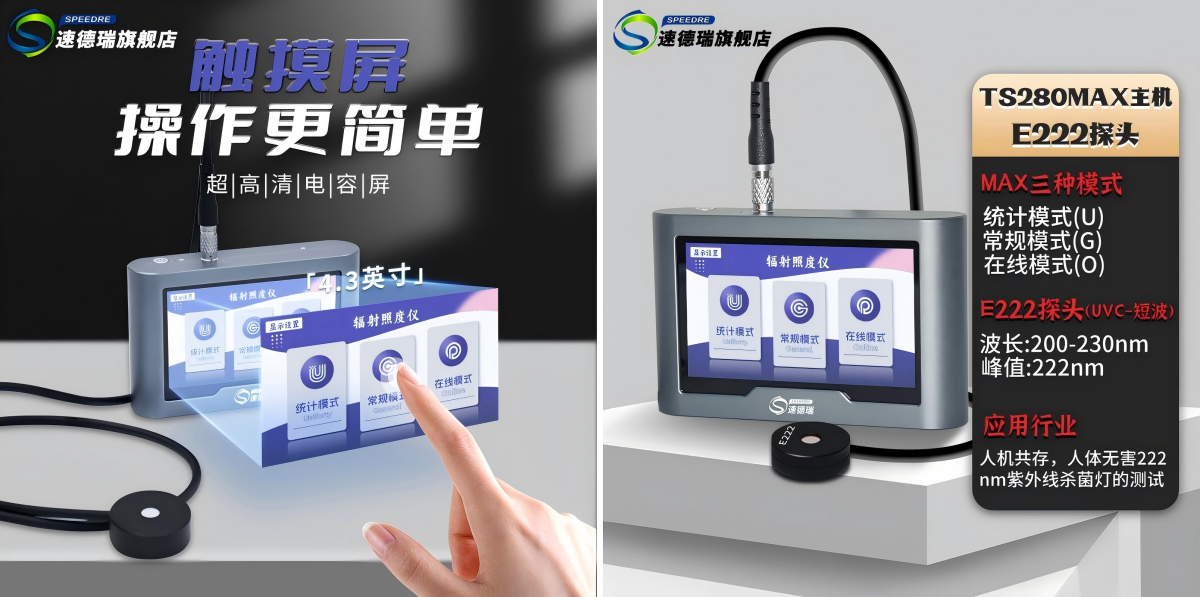 速德瑞TS280搭配E222探头,是200-230nm短波UVC场景的精准检测利器。E222探头专为222nm峰值波段优化,完美匹配准分子消毒灯、深紫外固化光源等新兴设备,解决了常规探头无法覆盖短波UVC的测量痛点,配合主机2048次/秒的超快采样与±5%以内的高精度误差,弱光场景也能稳定捕捉精准数据。主机与探头采用即插即用设计,航空级接口一推即锁,校准数据存储于主机,无需重复校准,搭配10亿超大量程自动切换功能,一台设备即可应对多场景测量,大幅降低重复购置与携带成本。4.3英寸触摸屏操作直观,且整机符合JJG879-2015等权威标准,可出具CNAS报告,为医疗消毒、实验室研发等领域提供合规质控保障,兼顾专业性与实用性。