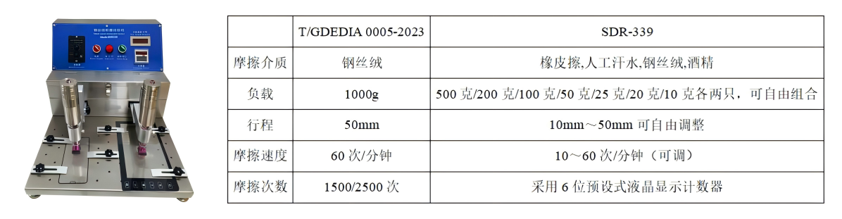 速德瑞多功能耐摩擦试验机SDR-339与《T/GDEDIA 0005-2023钢化膜 通用技术要求》耐磨测试要求完全适配,设备支持0000#钢丝绒介质,砝码重量可自行调节(500克/200克/100克/50克/25克/20克/10克各两只),负载可通过叠加精准达到标准要求的1000g,行程2~25mm或10~50mm、速度10~60次/min(可调),无段式可调整转速频率,且具备数显计数、自动停机、停电记忆功能,可直接满足钢化膜产品的质检与研发测试需求。