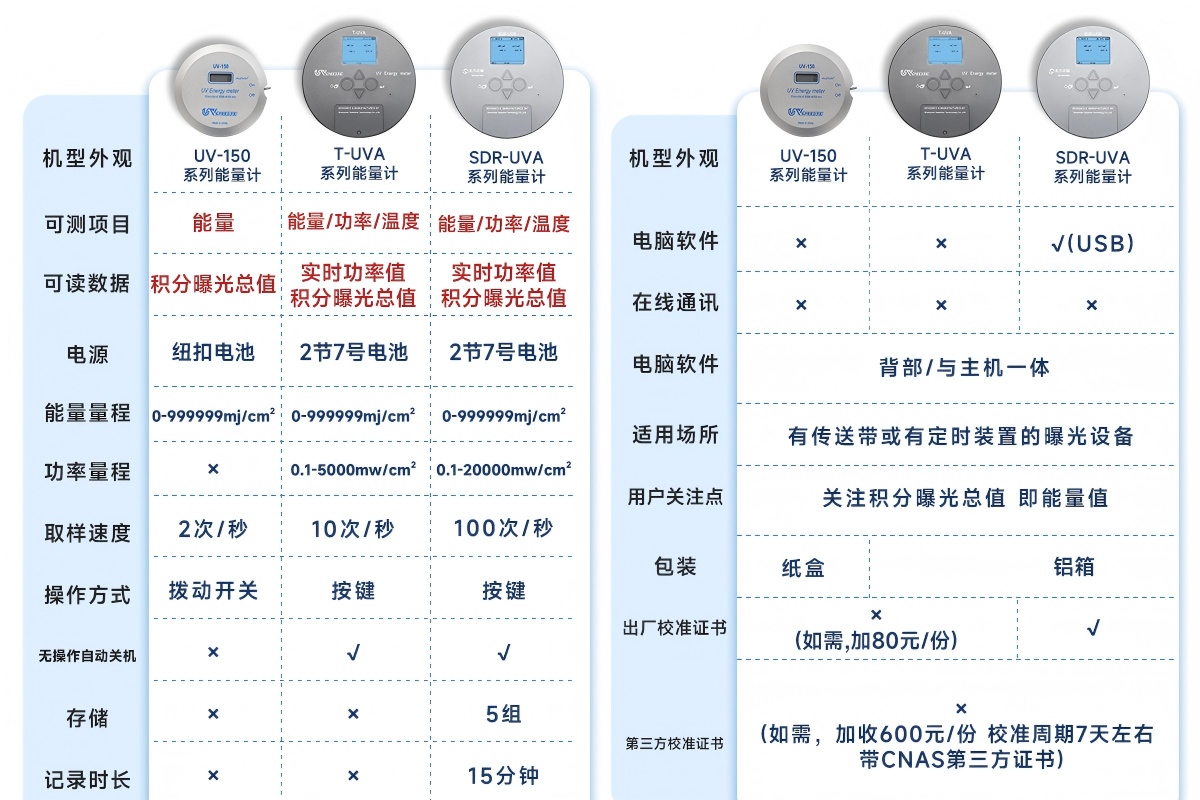 (2) 应用:检测UV消毒灯、消毒柜的实际照射能量,验证消毒工艺是否达到国标(如医用消毒的UVC能量阈值),同时判断消毒灯是否需要更换(光衰后能量不达标)。
