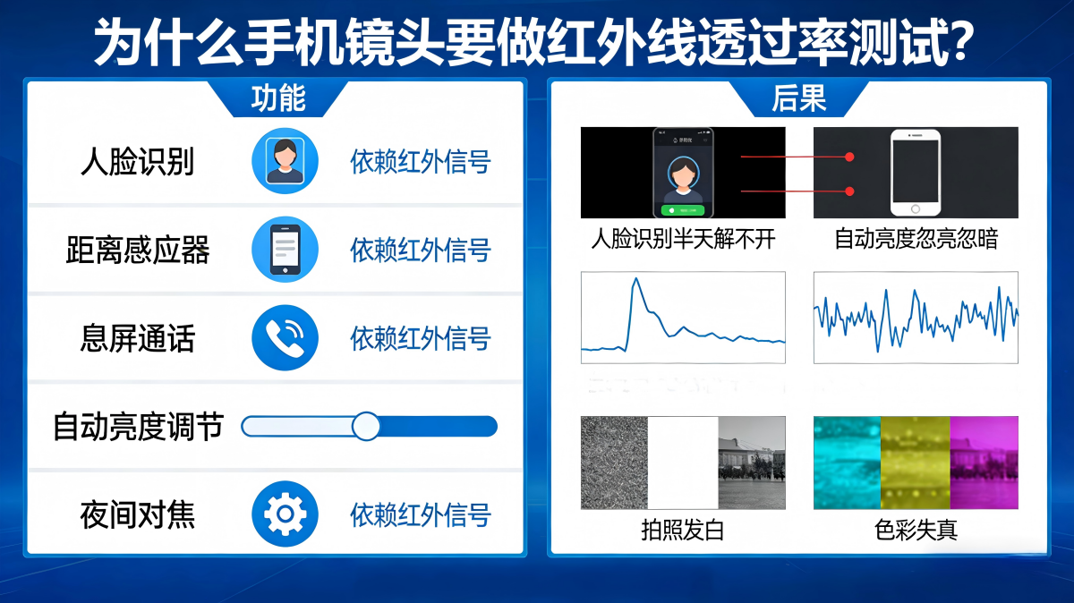 红外光虽然无法被人眼感知,却是手机实现智能化功能的重要基础,人脸识别、距离感应、环境光检测、夜间辅助对焦等功能,都需要依靠红外光的发射与接收来完成,这就要求对应位置的镜片对红外光有合适的透过率,保证信号稳定传输,否则会出现解锁缓慢、识别失败、通话时贴脸不黑屏、自动亮度调节异常等情况;同时,摄像头传感器对红外光十分敏感,多余的红外光进入镜头会导致画面泛白、对比度降低、色彩偏差,所以镜头镜片又需要精准过滤红外光,严格控制其透过率,正是这种差异化的需求,让红外透过率测试必不可少,它直接决定了手机各类感应功能是否灵敏、运行是否稳定。