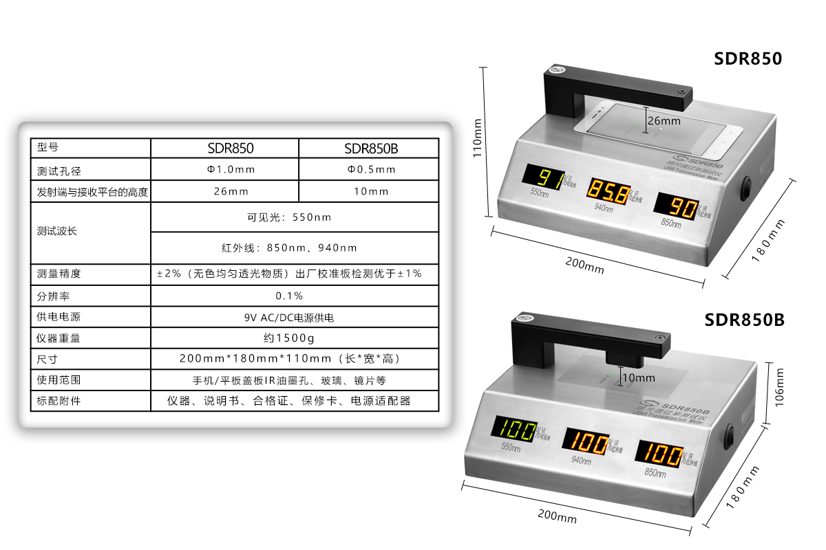 速德瑞SDR850镜片透过率测试仪是专为手机镜片、盖板、IR油墨孔等光学元件研发的专业检测设备,可同时精准测试550nm可见光、850nm和940nm红外三个关键波段的透过率,完美匹配手机镜片对可见光成像与红外感应的双重检测需求,仪器采用实时动态自动校准技术,开机即可自动校准至100%透过率,无需人工频繁调试,最小可测φ1.0mm的微小孔径,能够快速、稳定、准确地输出数据,清晰呈现镜片在不同波段的透光表现,既确保可见光成像清晰、屏幕显示通透,又严格把控红外感应通道的透过效果,为人脸识别、距离感应、自动亮度、相机成像等手机核心功能提供可靠的光学检测保障,其台式一体化设计操作简单、稳定性强,是手机镜片生产、质检、来料检验与品质管控的理想专用仪器。