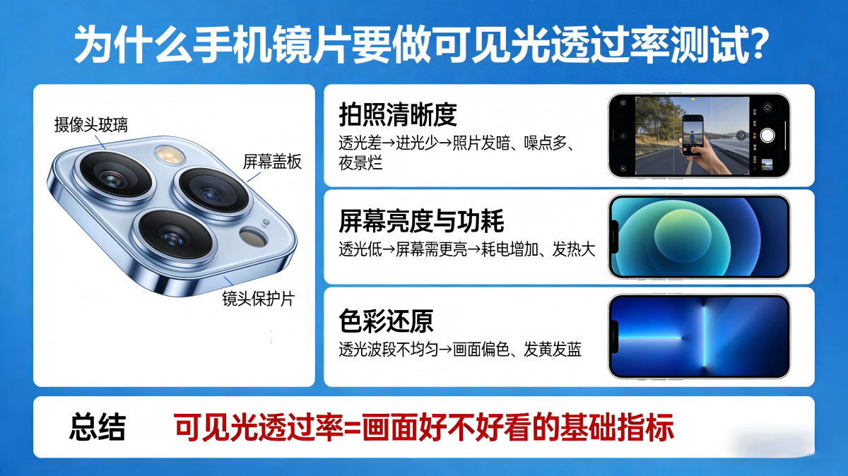 可见光作为人眼能够识别的光线,直接关系到手机的显示效果与成像质量,屏幕盖板的可见光透过率越高,屏幕显示就越清晰、通透、亮度均匀,不仅视觉更舒适,还能减少因强行提高屏幕亮度带来的功耗与发热问题;而摄像头保护镜片的可见光透过率,则直接决定进光量,透过率充足时,相机拍摄的画面更明亮、细节更丰富、色彩更真实,夜景拍摄也能减少噪点和模糊,反之则会出现画面昏暗、画质下降、色彩失真等问题,因此可见光透过率测试,本质是为了保障手机“看得清、看得好”。