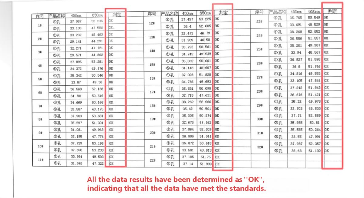 A total of 32 sets of data were collected in this measurement, covering multiple key areas of the flat plate perforation. It is delightful to note that all the data met the light transmittance standards set by the customer, which fully demonstrates the accuracy and effectiveness of the GB535 light transmittance instrument in the testing process. This result not only affirms the performance of the equipment but also recognizes the production process and product quality of the client company.